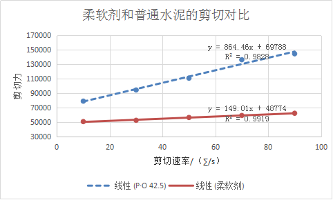 2.1纯P·O 42.5和内掺10%柔软剂的水泥浆体剪切力对比分析: