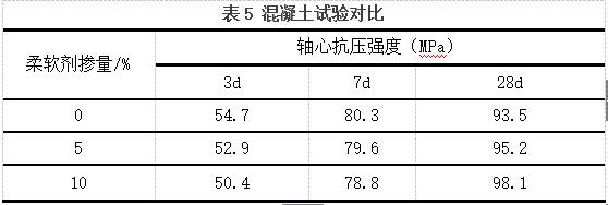 由表4可以看出,在聚羧酸高性能减水剂1.0%,柔软剂掺量(内掺)从0到5到10情况下,混凝土的坍落度变化是不大的,扩展度有了明显的提高,1.5h坍落度损失相对不大,扩展度损失逐渐降低,说明柔软剂相对水泥需水量和水化热较低,对混凝土有类减水、保坍、增加流动性等作用,含气量从29降至2.7,10%掺量的时候含气量不变可能是因为扩展度过大水中富集了气泡,混凝土倒筒时间逐渐减少,且混凝土逐渐成连续的絮状下落,混凝土的棍度变化明显是从中到优,混凝土也从一盘较硬的混凝土逐渐柔软,充分体现了柔软剂在混凝土带来的滚珠效应以及引入有效气泡的作用。