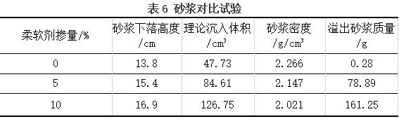 由表5看出,随着柔软剂掺量增加,椎体下落高度不断增加,因为柔软剂质量较轻,随着柔软剂的增加混凝土容重也有所降低,不影响混凝土后期强度,溢出砂浆的质量也逐渐增加,椎体下落的重力势能在接触砂浆的时候,转化成了椎体继续下落的动能、砂浆的内能和动能以及其他能耗,